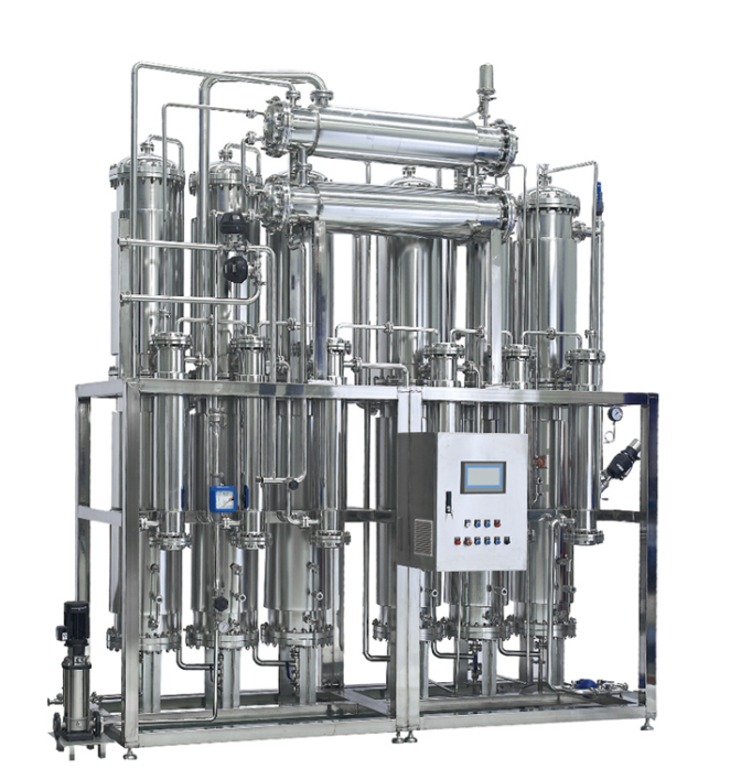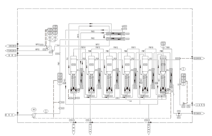 合格的原料水由多级泵增压后进入冷凝器,再依次进入各效预热器(原料水在冷凝器被二次蒸汽、蒸馏水加热,进入以后各效预热器被二次蒸汽的凝结水加热,在一效预热器被工业蒸汽凝结水加热),然后进入一效蒸发器经料水分配器喷射在加热管内壁,使料水在管壁成膜状流动,被工业蒸汽加热汽化。产生的夹带水滴的二次蒸汽,从蒸发室下端进入汽水分离装置,被分离的纯蒸汽进入下一效作为加热蒸汽,未被蒸发的原料水进入下一效,重复上述过程。末效产生的纯蒸汽进入冷凝器同来自除一效之外的各效的冷凝水汇合冷却,经排除不凝性气体后(根据机型的不同,在蒸发器上也可能设有此种不凝气体连续排放装置),成为注射用水。出口一般经过电导率的在线检测,合格的蒸馏水作为注射用水输出,不合格的蒸馏水将被排放。